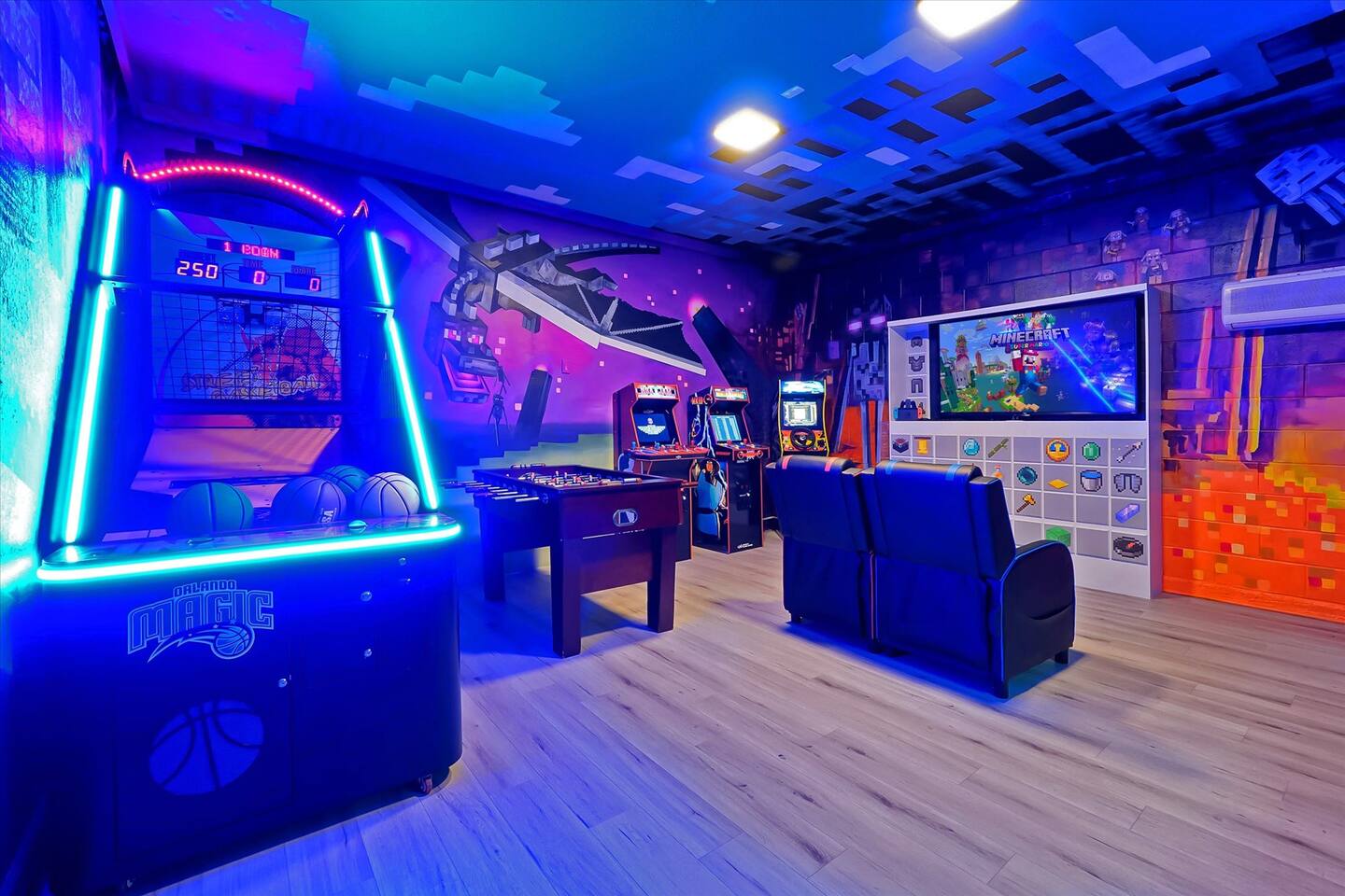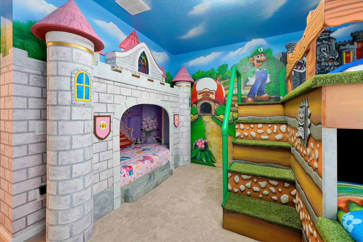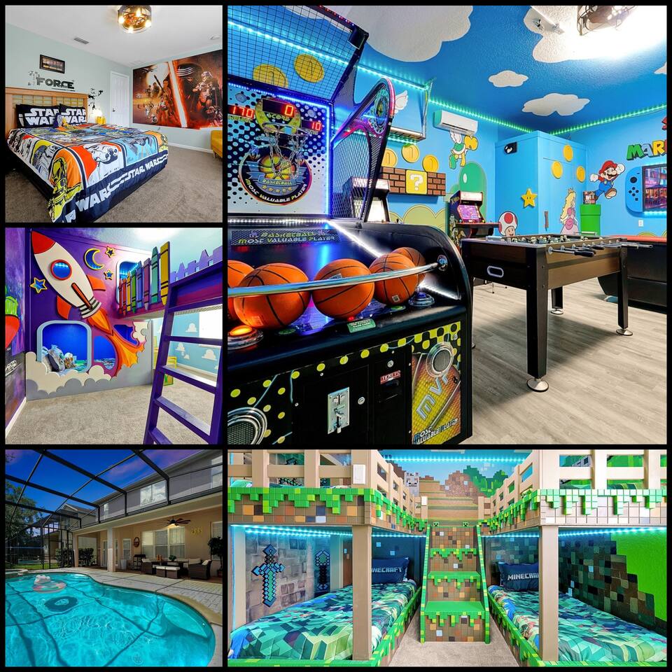 Welcome to The Colorful Vacation Homes! Themed Windsor Hills homes offers 6 bedrooms across two levels, giving families and groups the perfect balance of space and privacy. One of the few premium lots, it features a lush green view with no rear neighbors or a lot with the children playground next door. Bedrooms: The Colorful Cove; Main Floor: 2 King en suites + Toy Story, Star Wars & Minecraft-themed kids’ rooms Lower Level: 1 Queen bedroom The Colorful Haven: Main Floor: 2 King en suites + Epic World, HTTYD & Whimsical-themed kids’ rooms Lower Level: 1 Queen bedroom Entertainment: Enjoy a Mario-themed game room with arcade games in The Colorful Cove and Minecraft themed game room in The Colorful Haven, Nintendo Switch, basketball, air hockey, foosball, darts & board games. Outdoor Living: Relax by the private pool & spa, or enjoy dinner outdoors with the electric BBQ grill/Propane BBQ grill. Resort Perks: Guests get full access to Windsor Hills’ pool & water park, fitness center, sports courts, game room, movie theater & marketplace grill. Neighborhood: Family-friendly with parks, playgrounds, and green spaces just steps away. Perfectly designed for comfort, fun, and relaxation, this home is your ideal Orlando getaway!