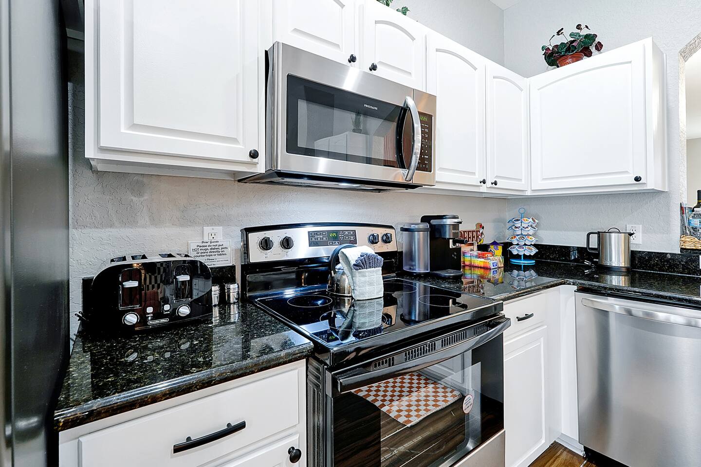 The full kitchen has everything you need to prepare delicious meals for the whole family. Enjoy modern appliances, plenty of counterspace, and a handy coffee and tea bar. An electric BBQ grill offers an alternative way to cook dinner!