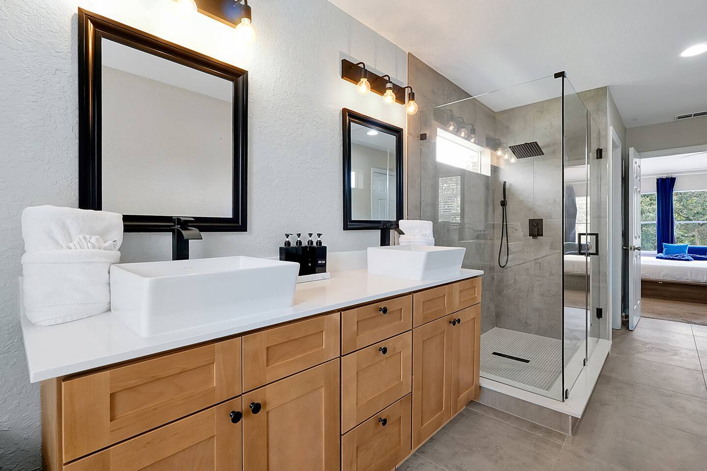 ✹Bathroom 1: Ensuite to bedroom 1 w/ dual sinks, a walk-in shower, and separate soaking tub + Pack n Play